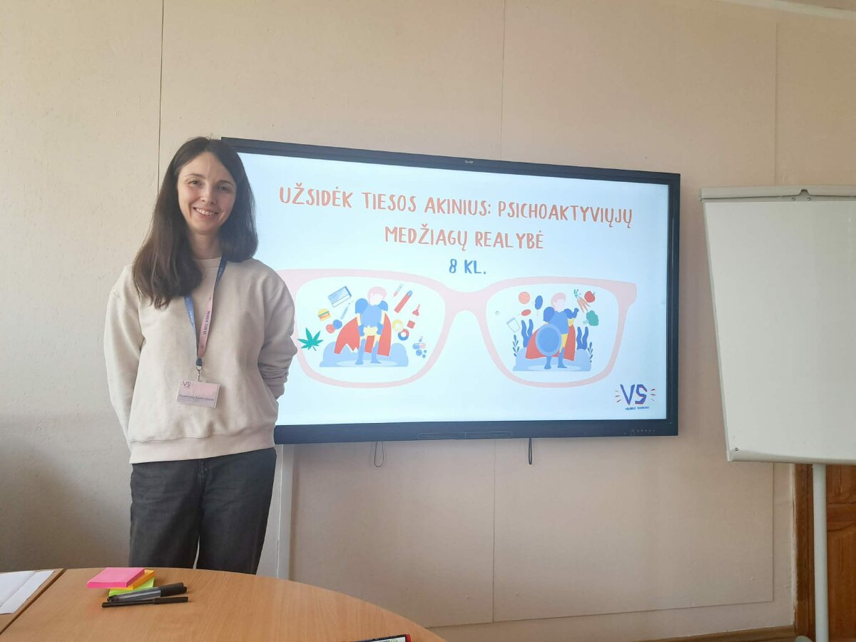 Kovo 23 d. 8-ų klasių mokiniams vyko prevencinė pamoka „Užsidėk tiesos akinius: psichoaktyvių medžiagų realybė“. Užsiėmimą vedė visuomenės sveikatos biuro (VSB) specialistė, kuri su mokiniais aptarė psichoaktyvių medžiagų vartojimo keliamas rizikas ir pasekmes.