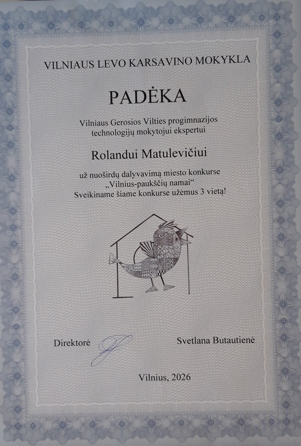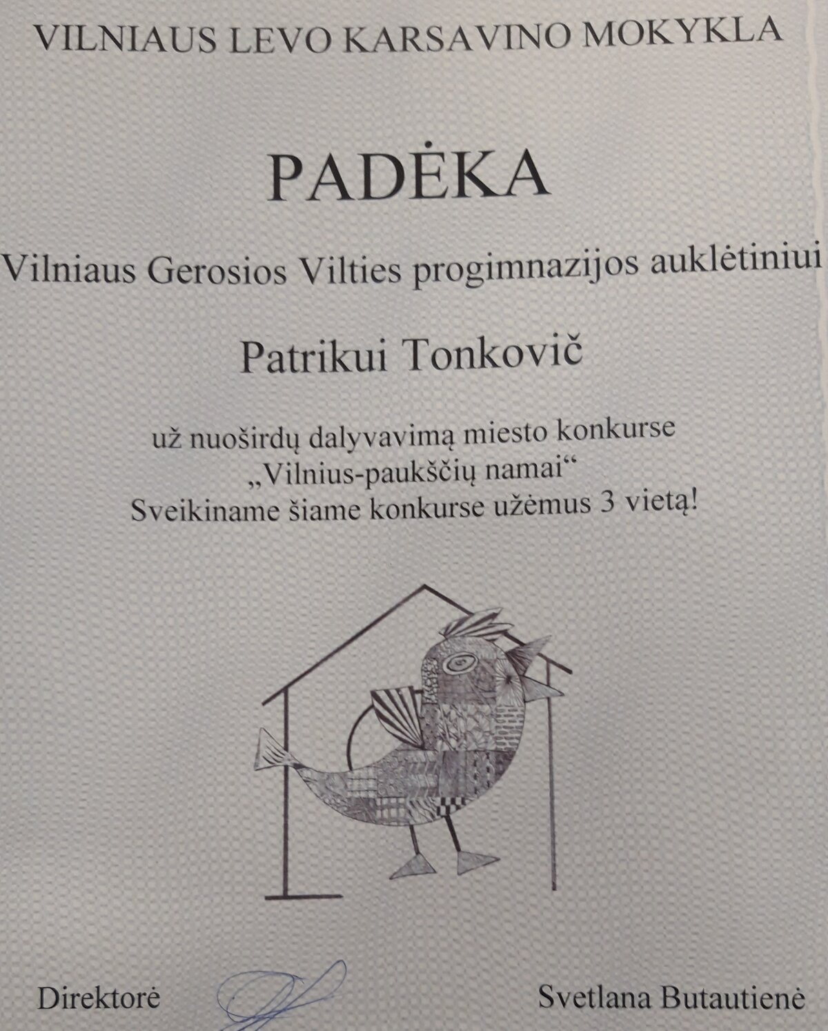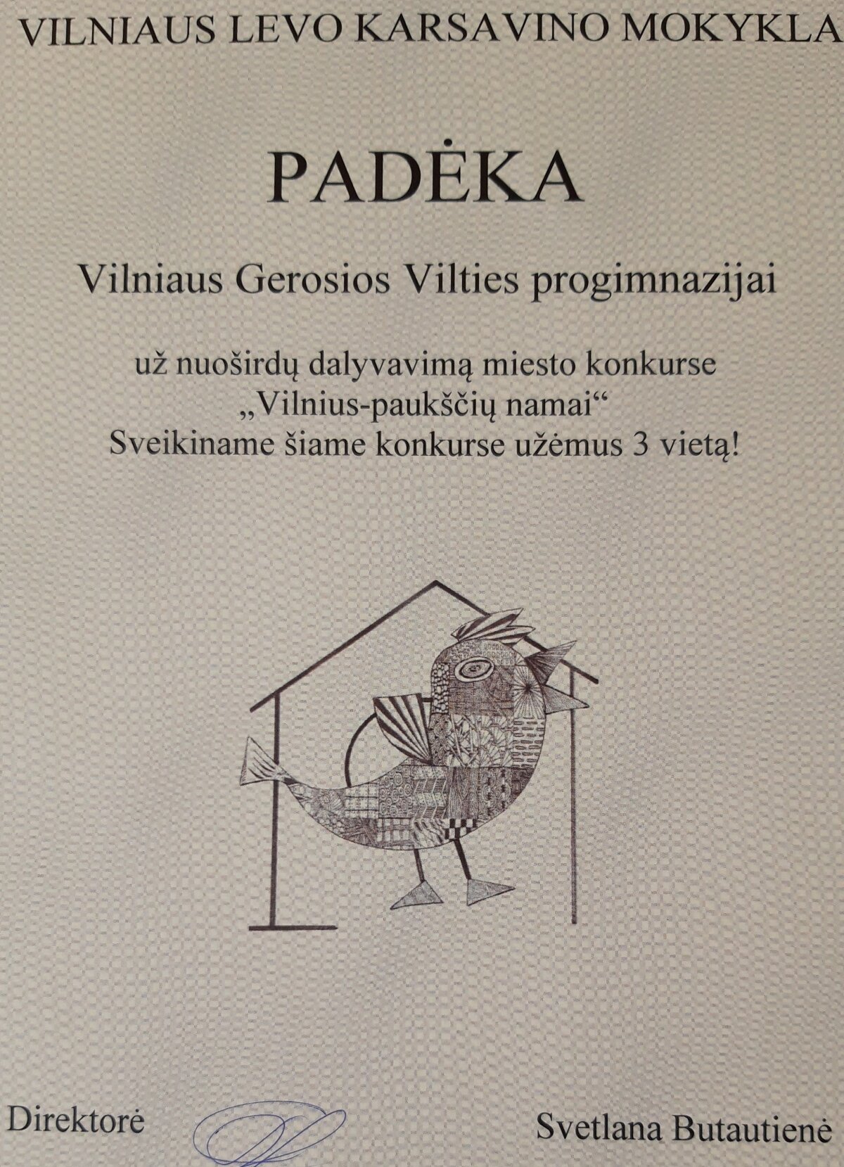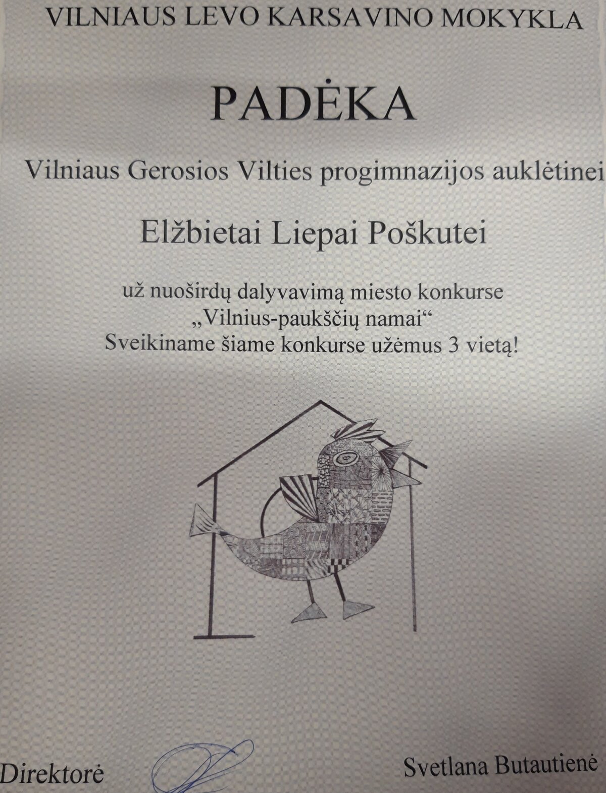 Skelbiami konkurso rezultatai: Vilniaus Gerosios Vilties progimnazijos 6 klasės mokiniai Elžbieta Liepa Poškutė ir Patrikas Tonkovič laimėjo 3 – ąją vietą. Mokiniams, mokytojui ir mokyklai įteikti padėkos raštai ir dovanėlės. Mokinius konsultavo technologijų mokytojas ekspertas Rolandas Matulevičius. Elžbietos Liepos ir Patriko pagaminti inkilai bus pakabinti medžiuose, kurie auga Gerosios Vilties progimnazijos teritorijoje.