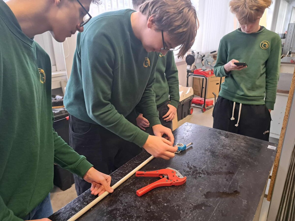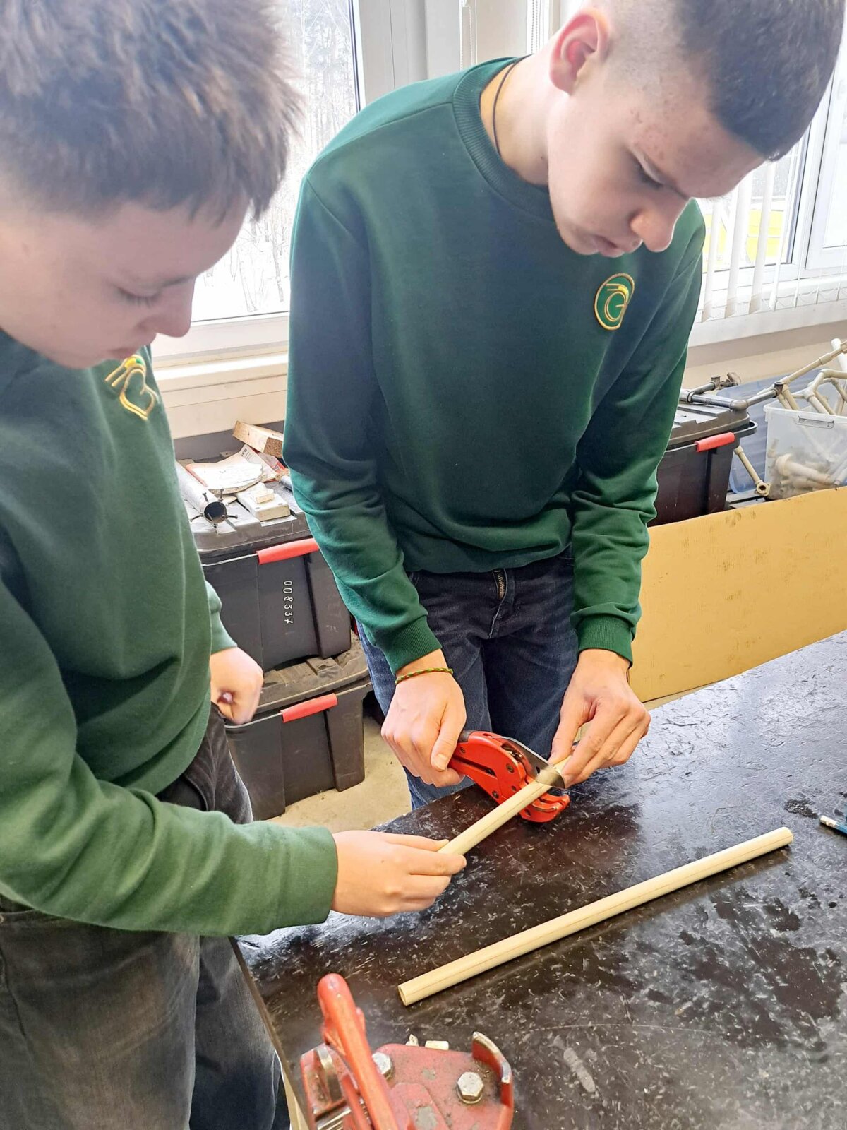 Naudodami įvairius vamzdžius ir specialius jų jungimo įrankius, mokiniai patys pagamino funkcionalius telefono laikiklius. Ši užduotis leido praktiškai išbandyti inžinerinių medžiagų apdirbimą ir suprasti vamzdynų montavimo principus.
