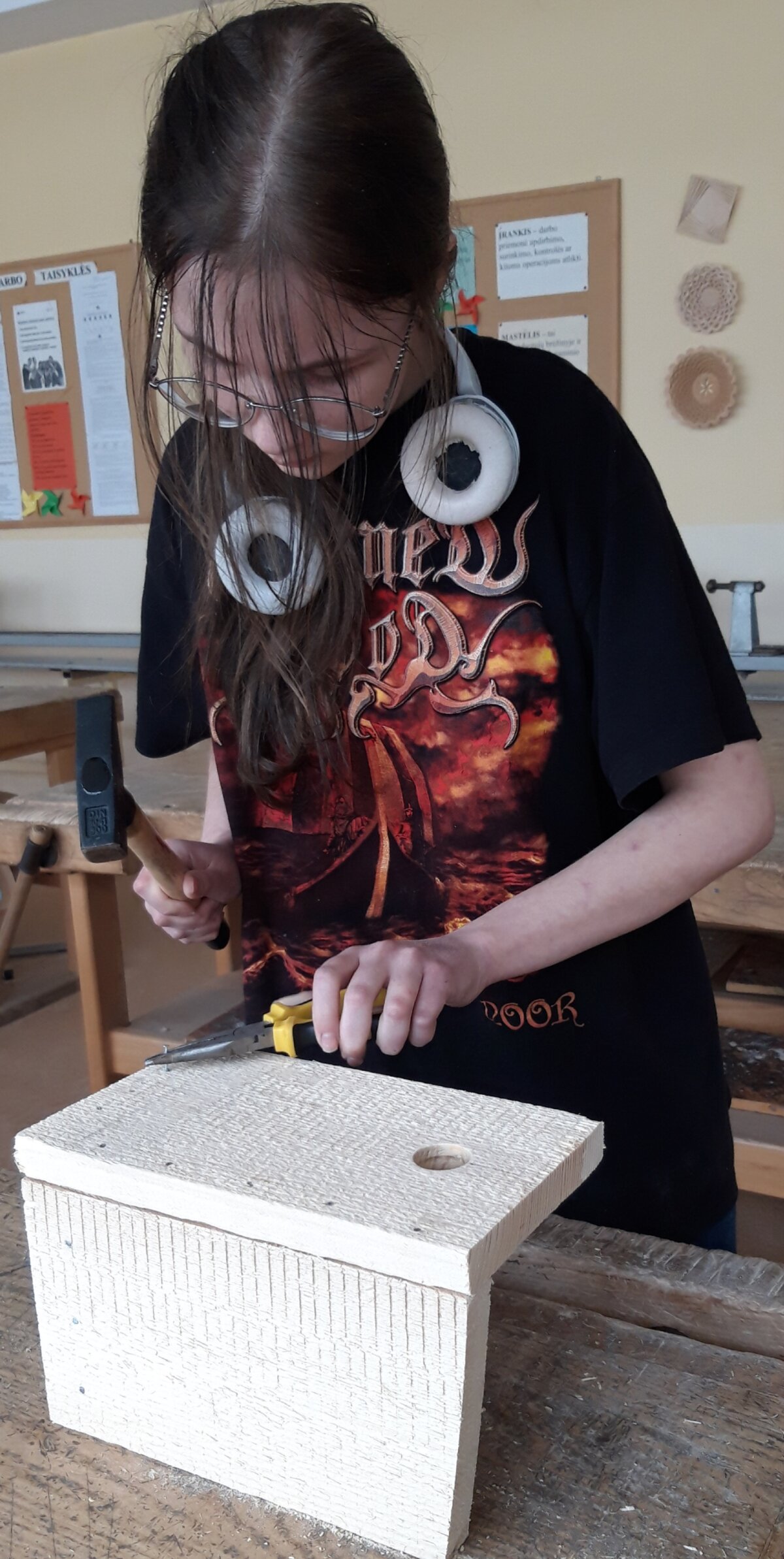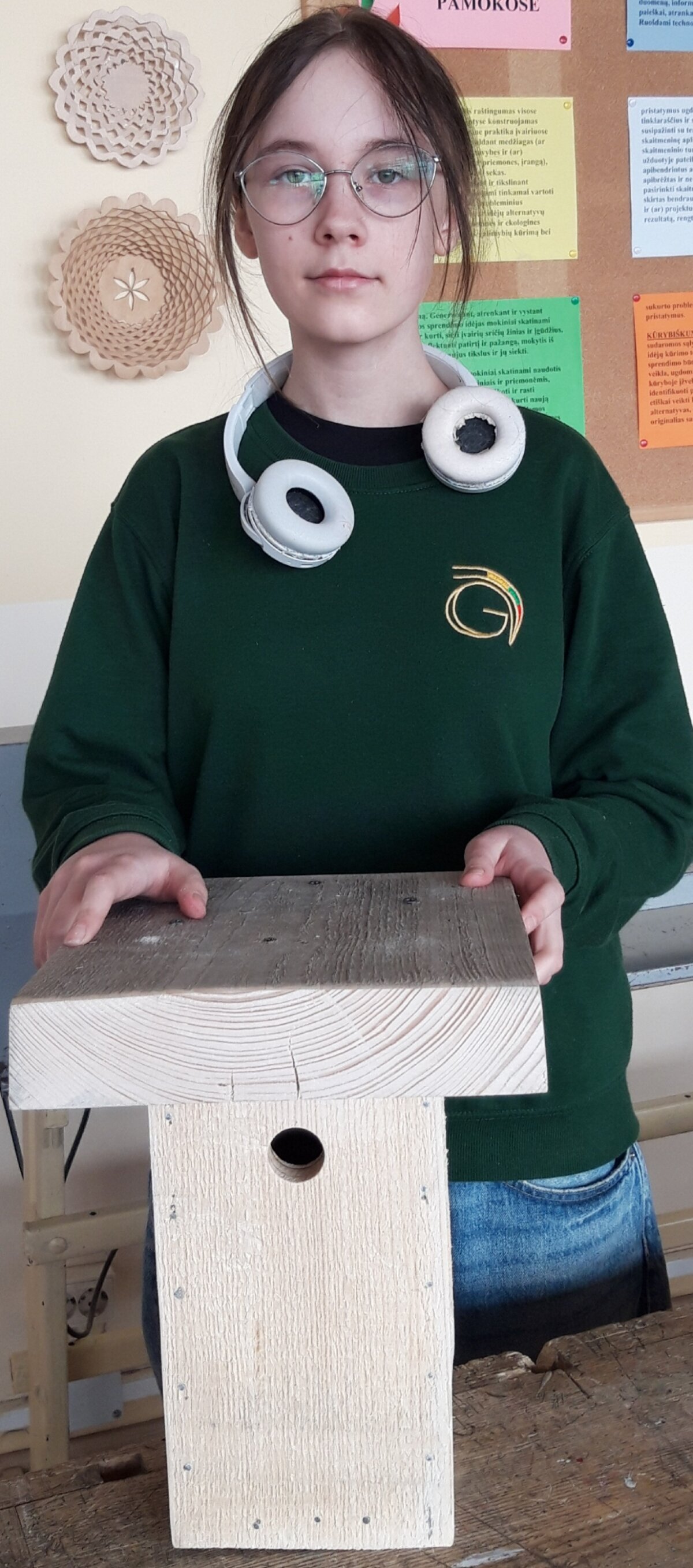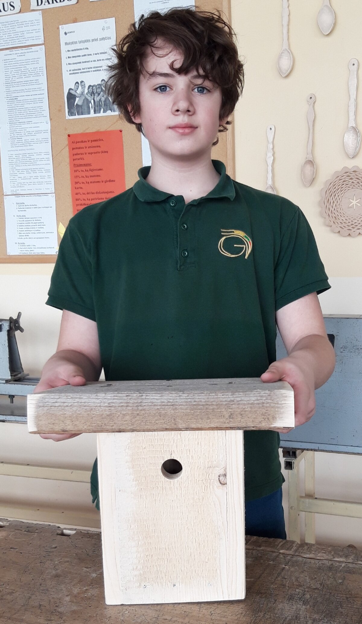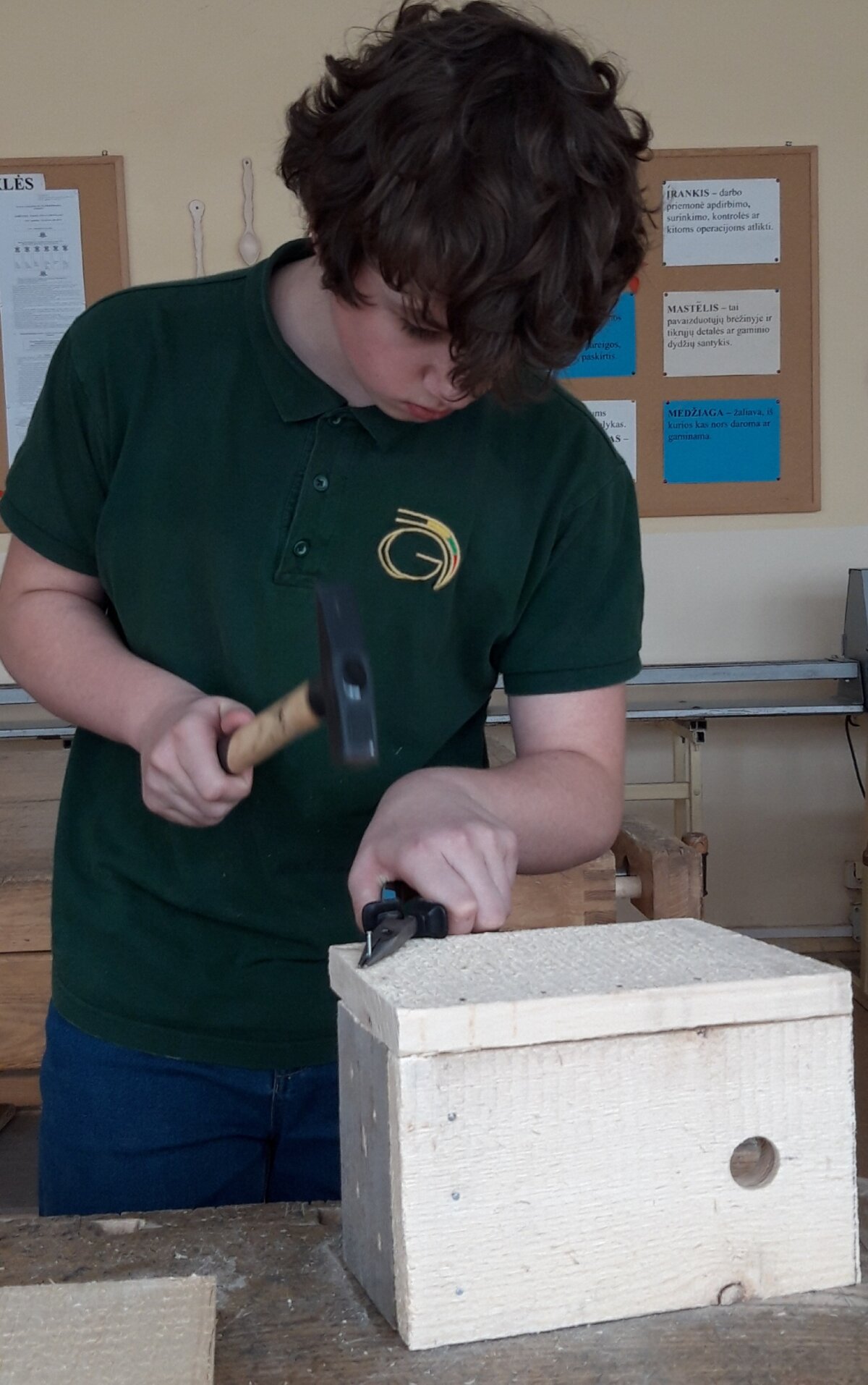 Nuo vasario 23 d. iki kovo 27 d. 6c klasės mokiniai Elžbieta Liepa Poškutė, Patrikas Tonkovič po pamokų technologijų kabinete gamino inkilus: vyko lentų matavimai ir pjovimas vienrankiu pjūklu, pagrindinėje inkilo sienoje tikslioje pažymėtoje vietoje su elektrinėmis gręžimo staklėmis buvo išgręžtos landos. Stogas yra iš storesnės lentos už šonus, stogo priekis už sienos išsikišęs 6 cm, o šonai išsikišę 3 cm. Stogas yra pritvirtintas su medsraigčiais, kad būtų galima lengvai atsukti su atsuktuvu ir nuėmus stogą išvalyti inkilo vidų rudenį arba ankstyvą pavasarį. Dugnas įleistas į vidų, kad greitai nesupūtų ir neiškristų. Dugne yra išgręžtos plonos 5 skylutės, kad pasišalintų perteklinė drėgmė.