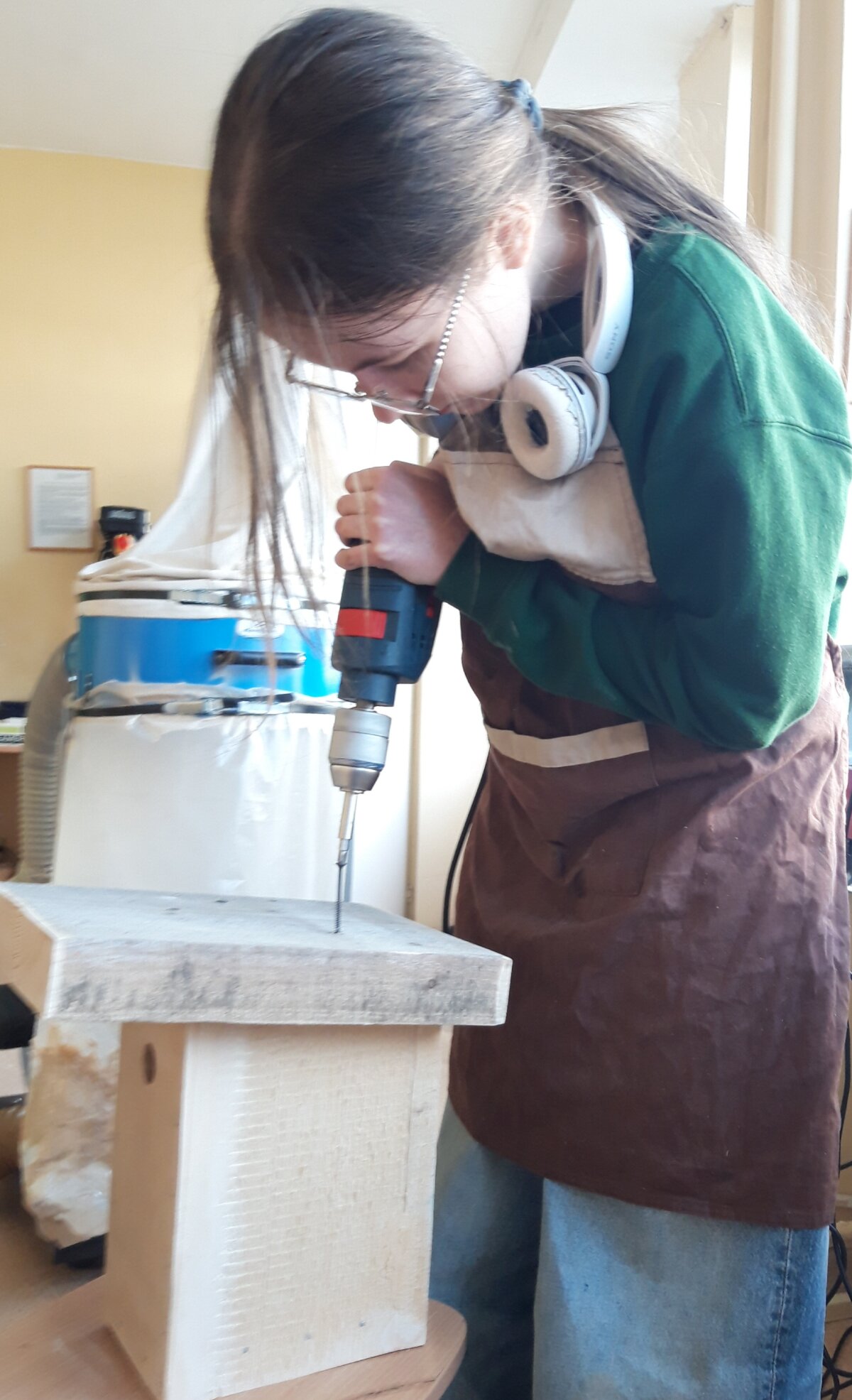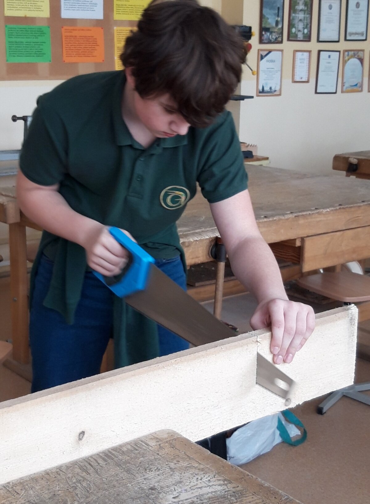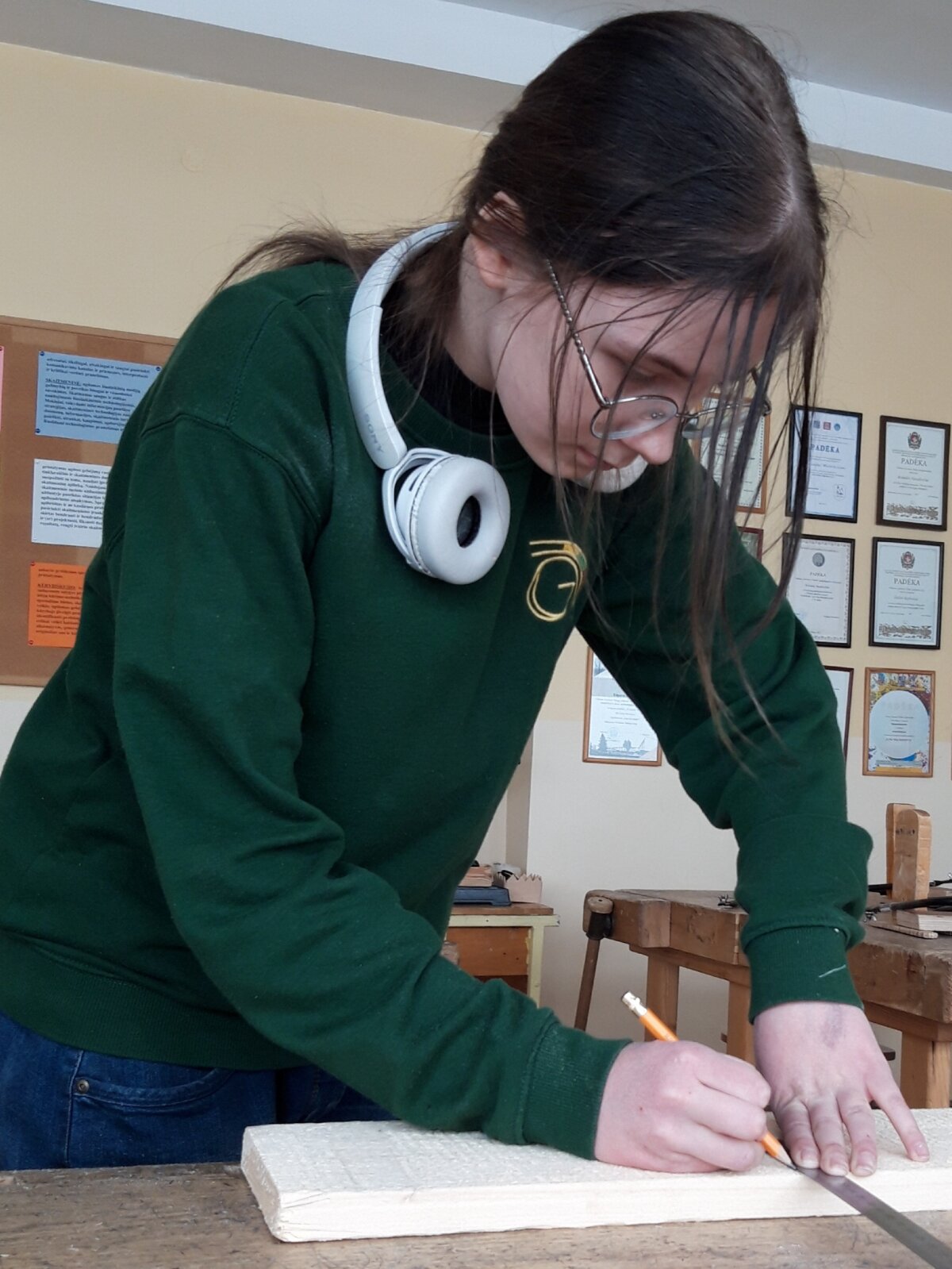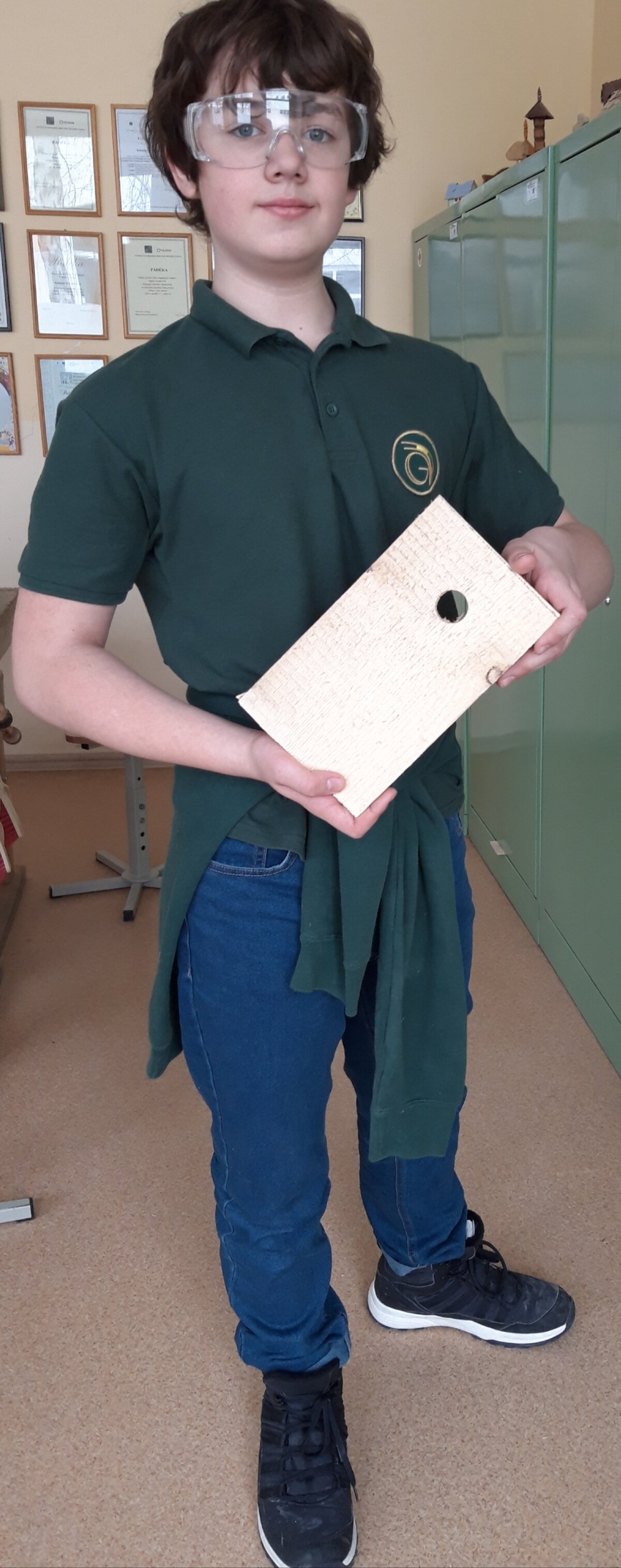 Nuo vasario 23 d. iki kovo 27 d. 6c klasės mokiniai Elžbieta Liepa Poškutė, Patrikas Tonkovič po pamokų technologijų kabinete gamino inkilus: vyko lentų matavimai ir pjovimas vienrankiu pjūklu, pagrindinėje inkilo sienoje tikslioje pažymėtoje vietoje su elektrinėmis gręžimo staklėmis buvo išgręžtos landos. Stogas yra iš storesnės lentos už šonus, stogo priekis už sienos išsikišęs 6 cm, o šonai išsikišę 3 cm. Stogas yra pritvirtintas su medsraigčiais, kad būtų galima lengvai atsukti su atsuktuvu ir nuėmus stogą išvalyti inkilo vidų rudenį arba ankstyvą pavasarį. Dugnas įleistas į vidų, kad greitai nesupūtų ir neiškristų. Dugne yra išgręžtos plonos 5 skylutės, kad pasišalintų perteklinė drėgmė.