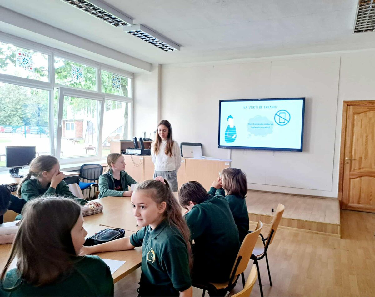 Užsiėmimo metu vaikai aktyviai dalyvavo diskusijoje, grupėse aptarė ekranų naudą ir žalą, dalinosi savo patirtimi. Ši prevencinė veikla paskatino mokinius kritiškai pažvelgti į savo kasdienius įpročius bei atrasti alternatyvų laiko leidimui be ekranų.