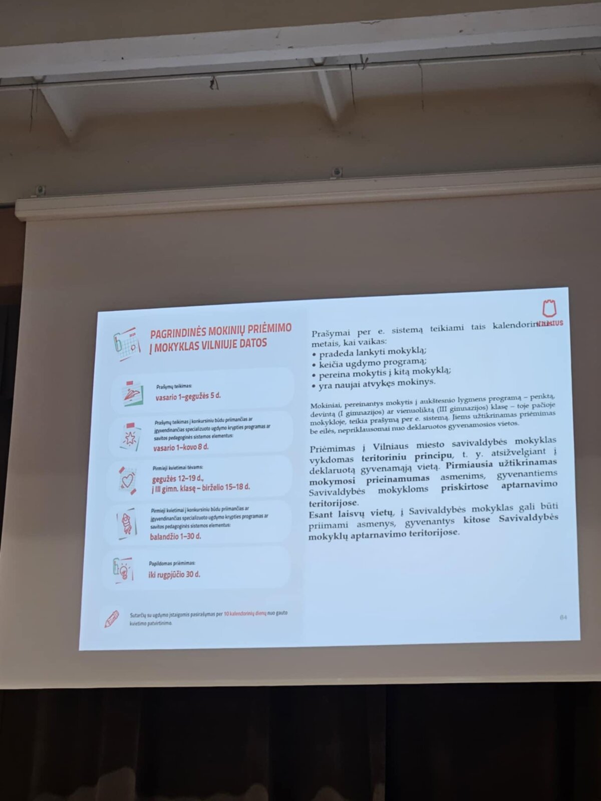 Susitikimo metu tėvams buvo pateikta ugdymo proceso organizavimo tvarka, pristatytos mokyklos vidaus ir lauko erdvės, supažindinta su ilgalaikiais progimnazijos projektais, tradiciniais renginiais, neformaliojo ugdymo veiklomis, visos dienos mokyklos (VDM) grupių veikla, mokinių uniformų komplektais bei priėmimo mokytis į progimnaziją tvarka.